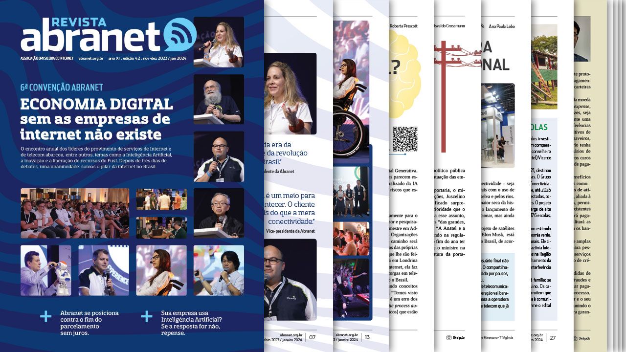 Veja a íntegra da revista digitalJul/Set 2023 - A edição 41, da revista Abranet, já está disponível. A reportagem principal é a cobertura do 3º Congresso Brasileiro de Internet, realizado pela Abranet e pelo ITS, e que discutiu como a tecnologia e a Internet são essenciais para a transformação social, econômica e digital do Brasil.