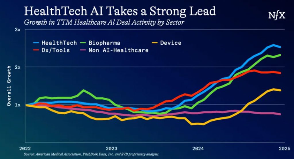 O capital tradicional da área da saúde é limitado e o financiamento de subsídios é instável. No entanto, a IA trouxe um novo conjunto de investidores para a mesa, segundo Drory, quando o foco é ampliado para onde a demanda está crescendo: saúde e IA em tecnologia da saúde, diagnósticos/ferramentas e biofarmacêutica. Aí o fluxo de negócios parece muito diferente e muito ativo.