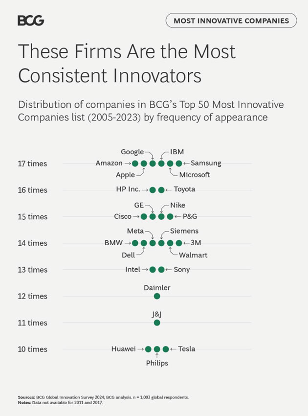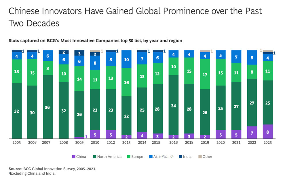 Entre outras coisas, o relatório destaca a ascensão da China entre as mudanças mais expressivas nos últimos 20 anos. Em 2005, nenhuma empresa chinesa aparecia no ranking. Em 2023, ocupavam 8 das 50 posições (16% do total da lista), incluindo 2 das 10 mais inovadoras. Desde 2009, quando a primeira entrou na lista, um total de 13 empresas chinesas foram classificadas. Enquanto isso, as empresas norte-americanas viram sua participação cair de quase três quartos da lista para cerca de metade, embora ainda representem dois terços das inovadoras em série – empresas que se classificaram 10 vezes ou mais.