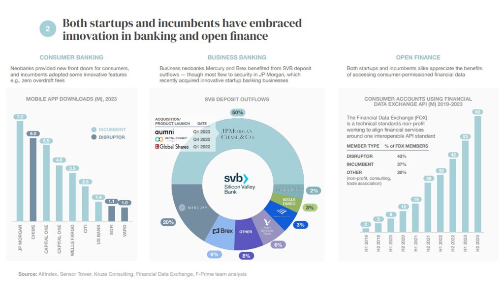 - Mobile banking: disruptores como Chime e SoFi competem de igual para igual com bancos tradicionais, mas sem dominar o mercado.