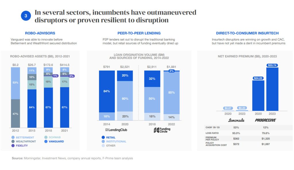 - Robo-advisors: incumbentes como Vanguard e Schwab absorveram rapidamente as funcionalidades.