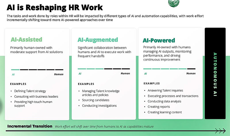 O relatório detalha como diferentes atividades de RH estão sendo redistribuídas entre humanos e IA: