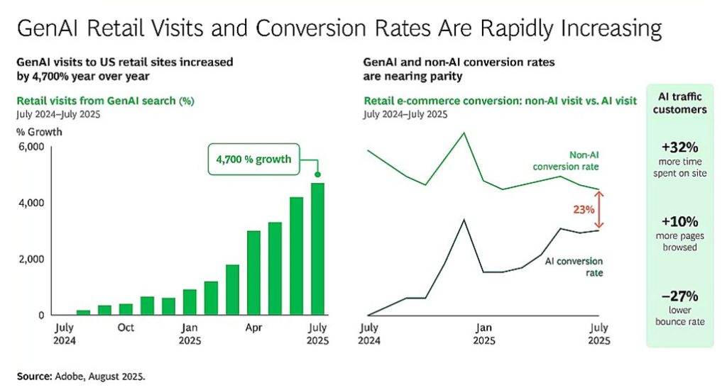 De acordo com levantamento do Boston Consulting Group (BCG), o tráfego de usuários a sites de varejo a partir de navegadores com GenAI aumentou 4.700% nos EUA em julho de 2025. Esses usuários passam 32% mais tempo, visitam 10% mais páginas e têm uma taxa de rejeição 27% menor do que os visitantes tradicionais.
