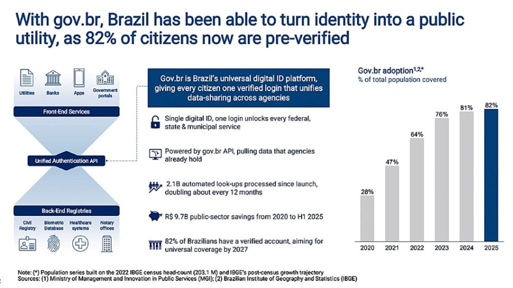 O Brasil lidera lidera mundialmente a digitalização de serviços públicos com o Gov.br, que já cobre 82% da população, com meta de universalização até 2027. Desde 2020, o governo economizou R$ 9,7 bilhões, com mais de 2,1 bilhões de acessos automatizados ao sistema. A abertura do Gov.br para o setor privado em 2025, com APIs para bancos e fintechs, marca um novo capítulo, democratizando o acesso à identidade digital e pressionando soluções privadas a se diferenciarem por inteligência e não apenas infraestrutura.