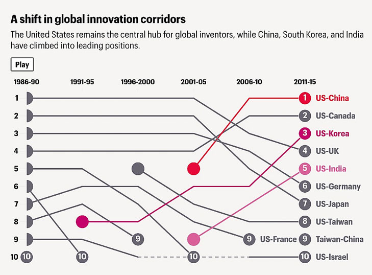 Historicamente, os Estados Unidos lideraram como hub de atração e redistribuição de inventores. As maiores rotas migratórias de inventores envolvem movimentos de e para os EUA, especialmente de países como China, Coreia do Sul, Índia e Japão. Contudo, as últimas duas décadas marcaram a emergência de novos polos de inovação no Leste Asiático. China, Coreia do Sul e Índia não apenas enviam inventores, mas os recebem de volta, promovendo ciclos virtuosos de aprendizado e inovação.