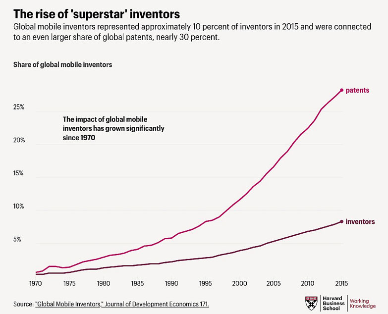 Essa hiperprodutividade lhes garante o status de “superstars” a esses inventores por sua capacidade de inovar e, principalmente, transmitir conhecimento de modo subentendido, aquele difícil de codificar, para novos ecossistemas. Como resumem os pesquisadores neste artigo para o Working Knowledge: “São os poucos inventores capazes de transferir conhecimento através das fronteiras, compartilhar com os locais e liderar o desenvolvimento de novos ciclos tecnológicos”.